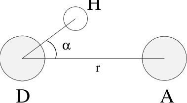 (471)\[\begin{split}\begin{array}{rclcl} r & \leq & r_{HB} & = & 0.35~\mbox{nm} \\ \alpha & \leq & \alpha_{HB} & = & 30^o \\ \end{array}\end{split}\]