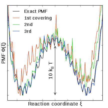 Often one may want to, post-simulation, calculate the unbiased PMF \(\Phi(u)\) of another variable \(u(x)\). \(\Phi(u)\) can be estimated using \(\xi\)-biased data by reweighting (“unbiasing”) the trajectory using the bias potential \(U_{n(t)}\), see (349). Essentially, one bins the biased data along \(u\) and removes the effect of \(U_{n(t)}\) by dividing the weight of samples \(u(t)\) by \(e^{-U_{n(t)}(\xi(t))}\),