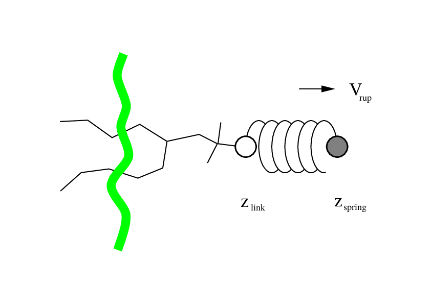 Fig. 38 Schematic picture of pulling a lipid out of a lipid bilayer with umbrella pulling. \(V_{rup}\) is the velocity at which the spring is retracted, \(Z_{link}\) is the atom to which the spring is attached and \(Z_{spring}\) is the location of the spring.¶